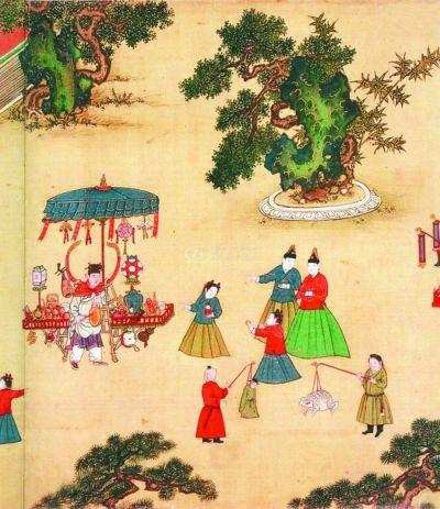 据人民网 年后正月十五的上元节,或称元宵节,也在“年”的范围之内。作为新年的第一个月圆之夜,人们在这一天要赏月、观灯、吃元宵等,极尽欢乐。从宋代孟元老《东京梦华录》、吴自牧《梦粱录》、周密《武林旧事》书中记载可知,早在宋代,对于元宵节的庆贺场面就已经十分盛大。而现存描绘这一佳节最著名的作品便是近日在国家博物馆展出的《明宪宗元宵行乐图》。此幅作品绢本设色,纵36.6厘米,横达630.6厘米,画面以庭院红墙隔开分为三段,使得画面既得到区分,又具有整体性;这种分隔画面的方式还可在五代顾闳中的《韩熙载夜宴图》中找到更为早期的表达。